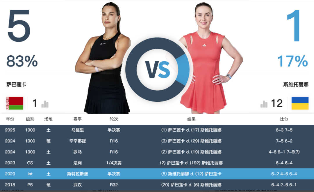 双方交手记录另一个值得关注的是6次交手大多发生在红土场,唯二的两次硬地对垒都是萨巴笑到了最后。2018年武汉公开赛,当时萨巴苦战三盘取胜,尽管彼时的白俄罗斯人出众的实力已然冒头,但大赛关键阶段的频频掉链子还是让她饱受质疑。2024年辛辛那提站,萨巴直落两盘击败对手,硬地女皇风采完全显露。
