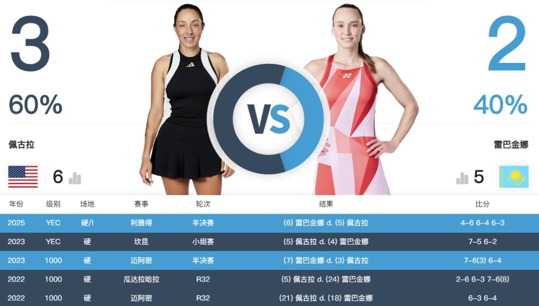 双方前四次交手都是发生在2022与2023赛季,彼时莱巴金娜尚未受到武科夫事件影响,竞争力正处在职业生涯的第一个高峰,面对这样的莱巴金娜,佩古拉尚能打出三胜一负的表现。某种程度上也能说明,“大富”冷静的心理与多变的战术对高举高打的哈萨克斯坦人有一定的制约作用。