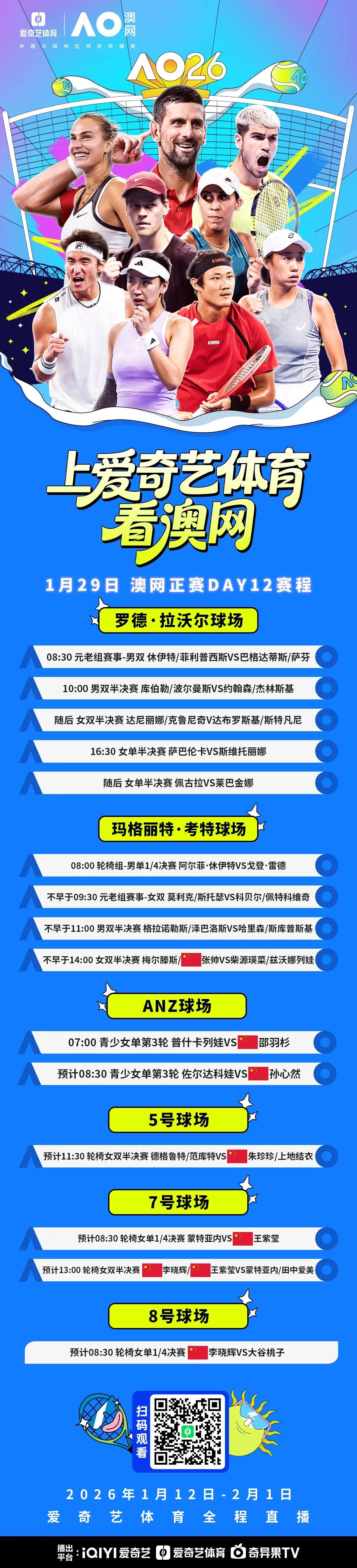 北京时间1月29日,爱奇艺体育全程直播的2026澳大利亚网球公开赛将进入到半决赛的争夺。